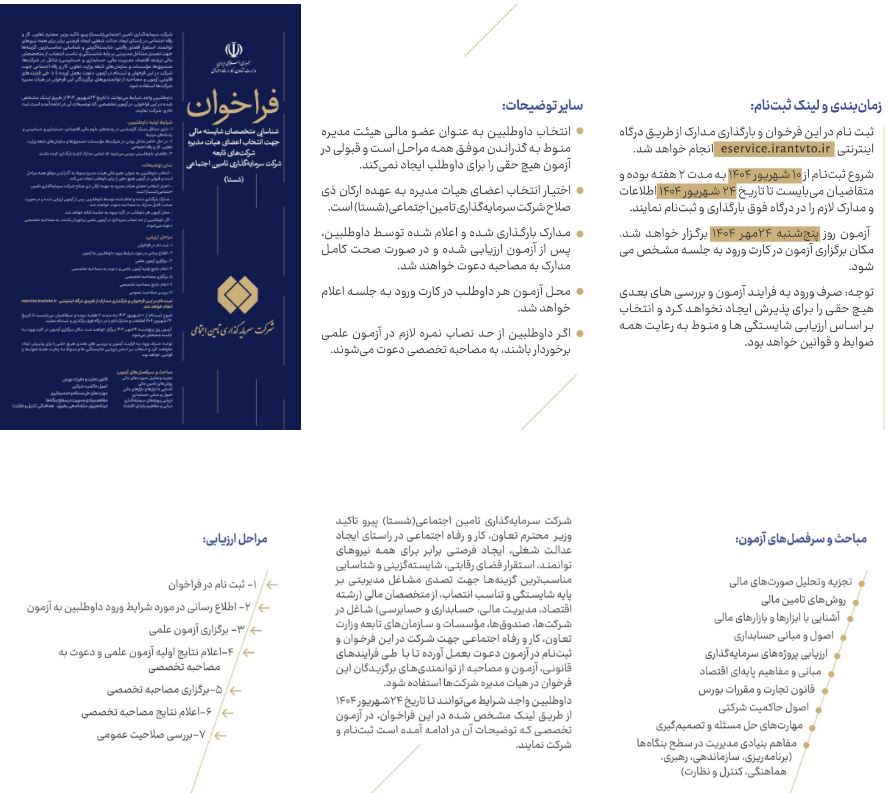 انتخاب داوطلبین به عنوان عضو مالی هیات مدیره منوط به گذراندن موفق همه مراحل است و قبولی در آزمون هیچ حقی را برای داوطلب ایجاد نمیکند.