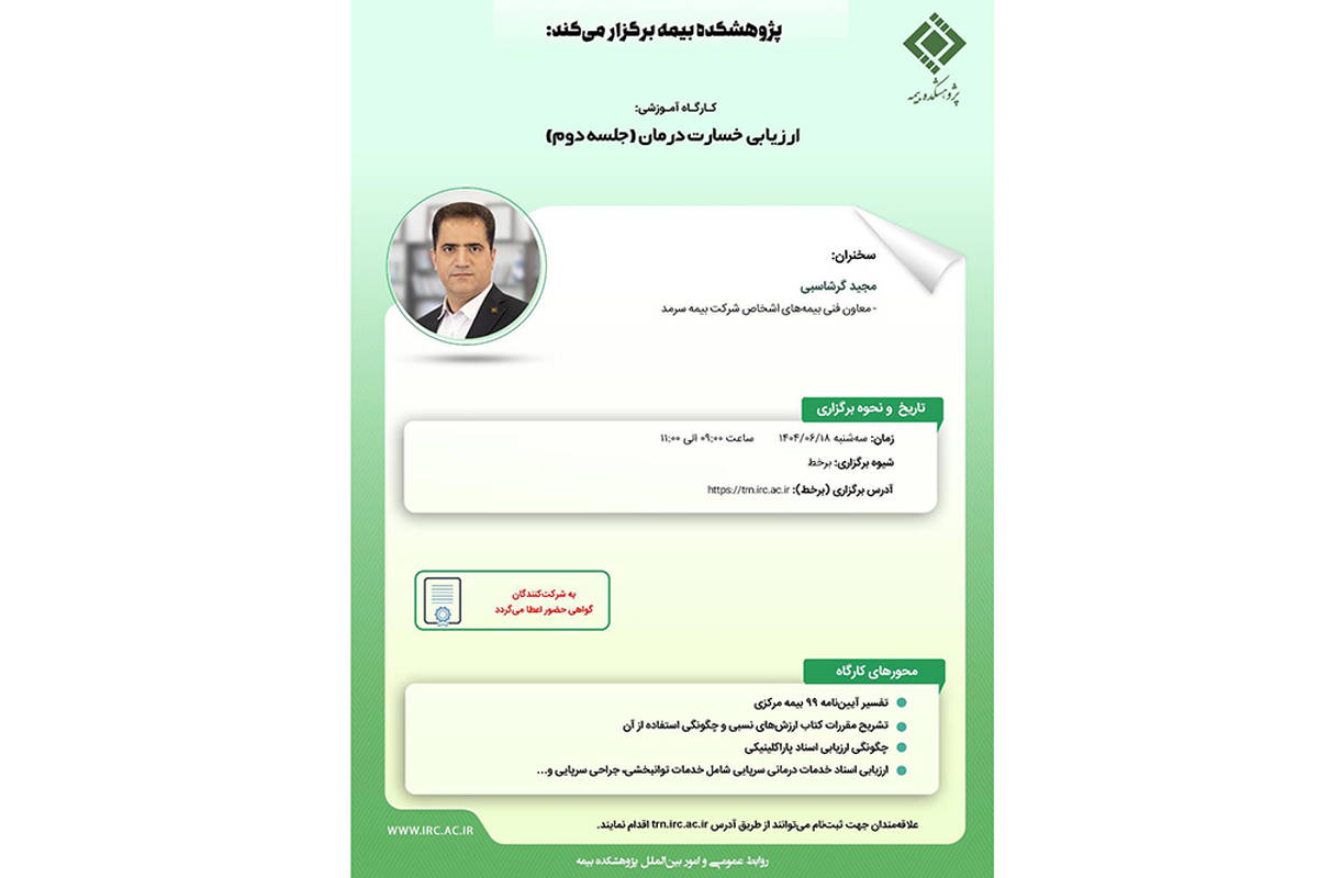 کارگاه آموزشی با عنوان "ارزیابی خسارت درمان (جلسه دوم)" از ساعت ۹:۰۰ تا ۱۱:۰۰ روز سه‌شنبه ۱۸ شهریورماه ۱۴۰۴ به صورت برخط از طریق سامانه مدیریت یادگیری پژوهشکده بیمه برگزار می‌شود.