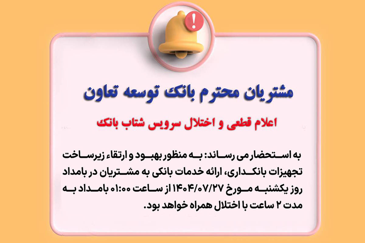 به نقل از روابط عمومی بانک توسعه تعاون، به منظور بهبود و ارتقاء زیرساخت تجهیزات بانکداری، ارائه خدمات بانکی به مشتریان در بامداد روز یکشنبه مورخ ۱۴۰۴/۰۷/۲۷ از ساعت ۰۱:۰۰ بامداد به مدت ۲ ساعت با اختلال همراه خواهد بود.