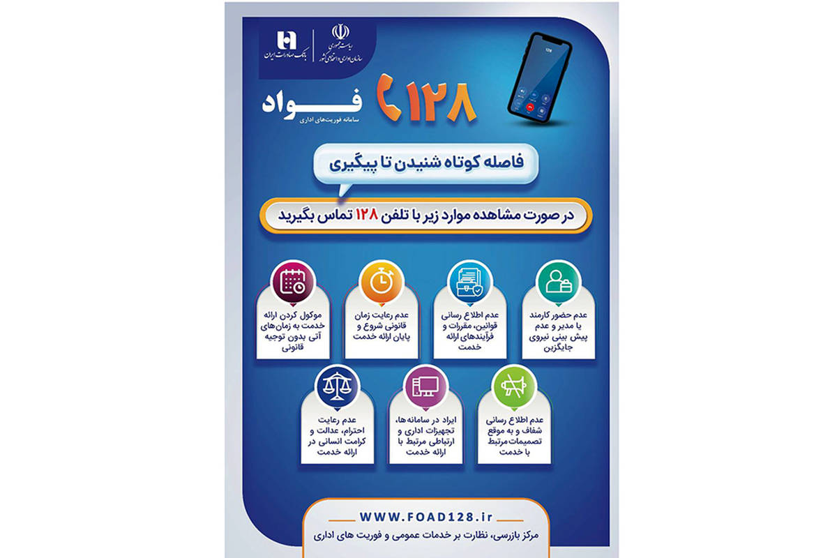 مشتریان و مخاطبان محترم بانک برای ارتباط مستقیم و طرح مسائل، مشکلات و دغدغههای خود میتوانند با شماره تلفن 128 تماس گرفته و یا به سایت www.foad128.ir مراجعه کنند.