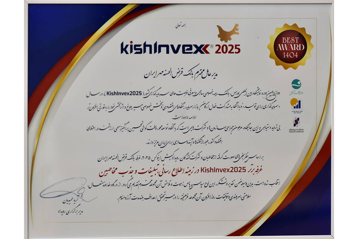 کسب نشان غرفه برتر توسط بانک قرض‌الحسنه مهر ایران در جذب مخاطب کیش اینوکس ۲۰۲۵