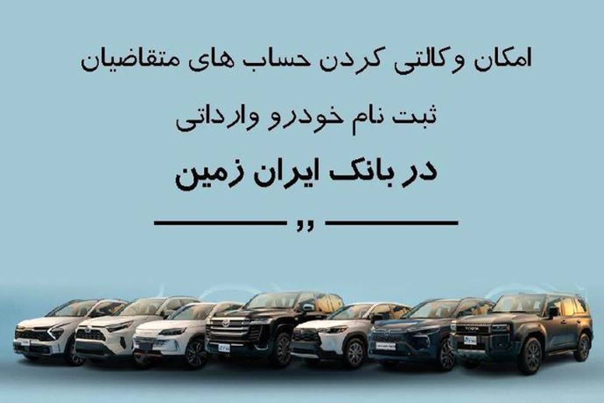 امکان معرفی حساب وکالتی برای ثبت نام خودرو وارداتی در بانک ایران زمین فراهم است.