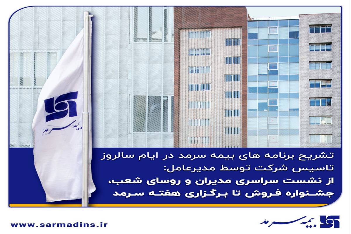 مدیرعامل بیمه سرمد در ادامه به برگزاری نشست سراسری بیمه سرمد با حضور اعضای هیئت مدیره، مدیران ستادی و مدیران شعب شرکت اشاره کرد و افزود: نشست سراسری مدیران ستادی و مدیران شعب استانی بیمه سرمد با هدف تبیین سیاستها و برنامههای آتی شرکت، بررسی مسائل و مشکلات جاری، ارزیابی عملکرد شعب و نیز تقویت همدلی و ارتباط مدیران شعب و ستاد از چهارشنبه ۲ لغایت جمعه ۴ ابان در مشهد مقدس برگزار میشود.