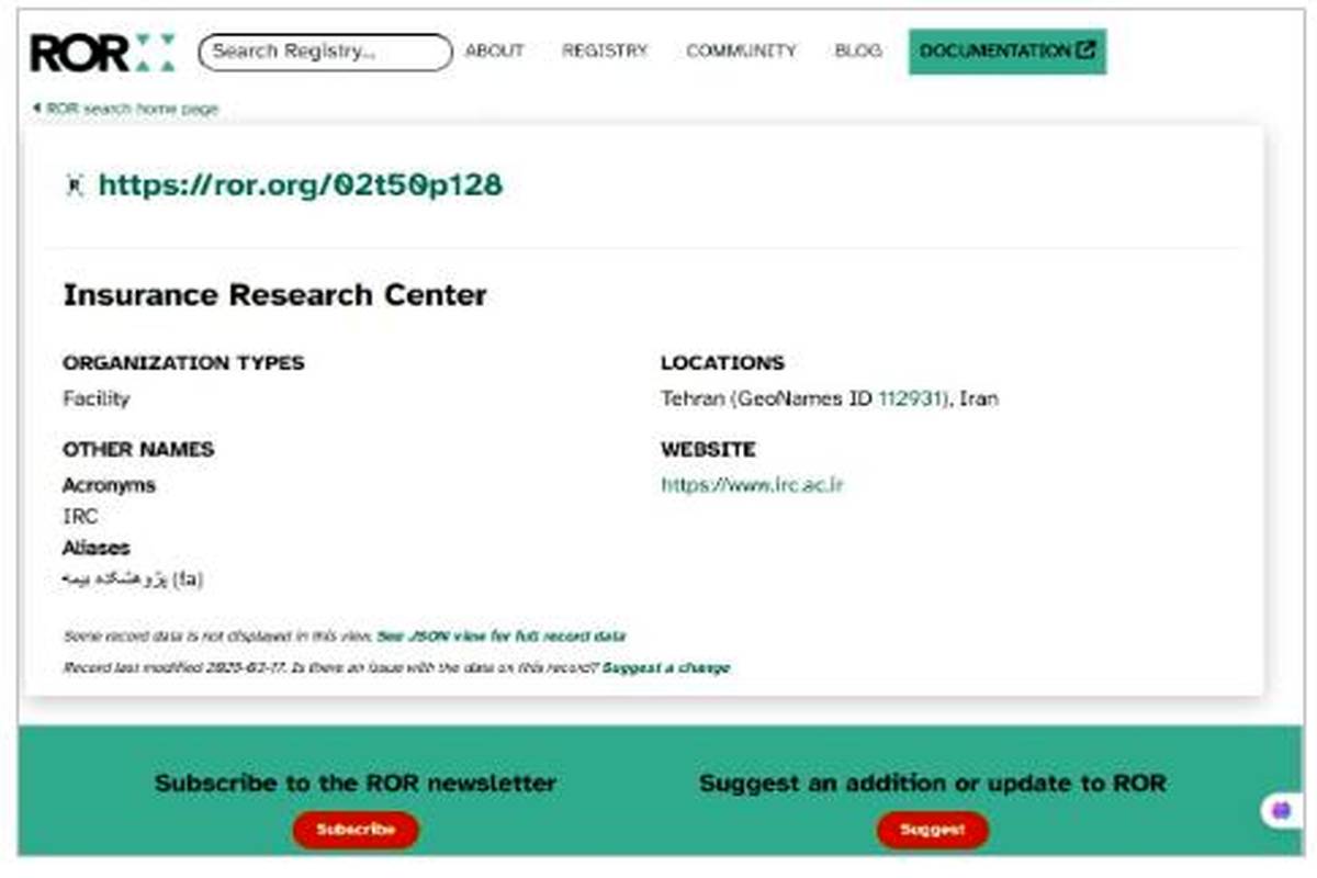 در تازه‌ترین دستاورد علمی و بین‌المللی، پژوهشکده بیمه موفق به ثبت رسمی در سامانه جهانی ثبت سازمان‌های پژوهشی ۱(ROR) شد. این ثبت، پس از انجام مکاتبات رسمی با این نهاد بین‌المللی، با موفقیت انجام پذیرفت و نام پژوهشکده بیمه به عنوان یک سازمان پژوهشی معتبر در پایگاه ROR درج گردید.