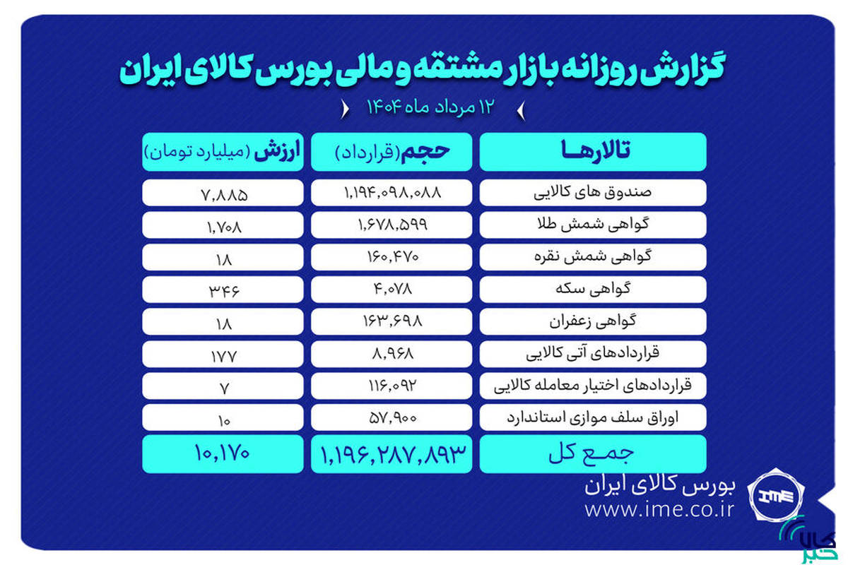 روز گذشته در بازار مشتقه و مالی بورس کالای ایران در مجموع بیش از یک میلیارد و ۱۹۶ میلیون و ۲۸۷ هزار و ۸۹۳ قرارداد به ارزش ۱۰ هزار و ۱۷۰میلیارد تومان منعقد شد.