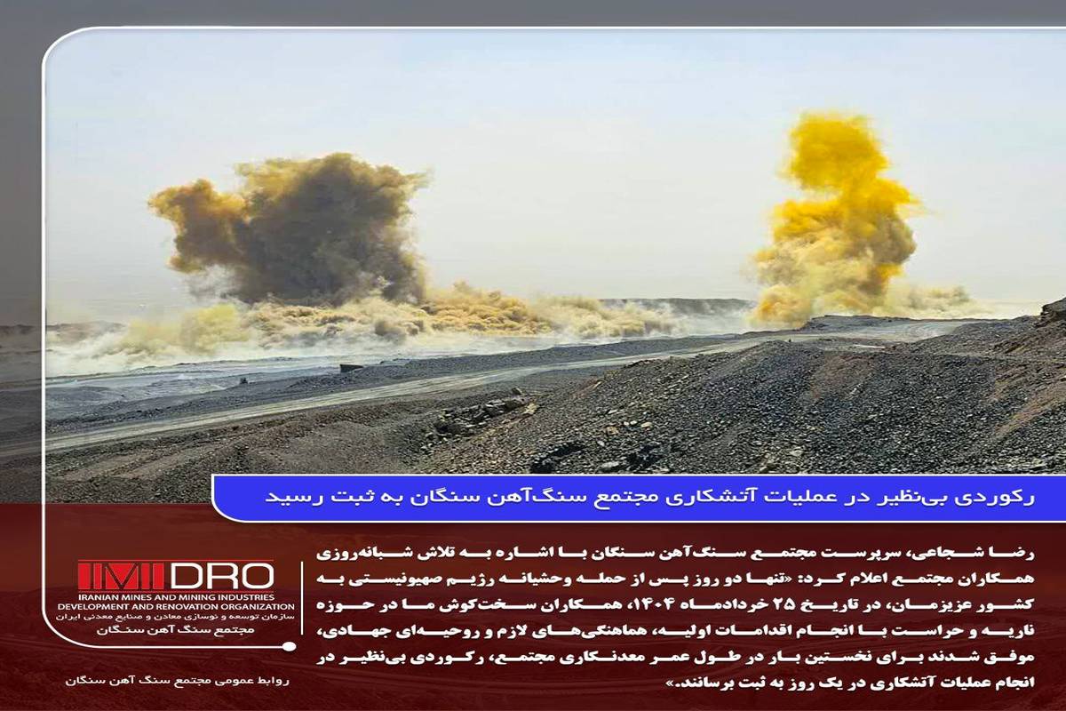 رضا شجاعی، سرپرست مجتمع سنگآهن سنگان با اشاره به تلاش شبانهروزی همکاران مجتمع اعلام کرد: «تنها دو روز پس از حمله وحشیانه رژیم صهیونیستی به کشور عزیزمان، در تاریخ ۲۵ خردادماه ۱۴۰۴، همکاران سختکوش ما در حوزه ناریه و حراست با انجام اقدامات اولیه، هماهنگیهای لازم و روحیهای جهادی، موفق شدند برای نخستین بار در طول عمر معدنکاری مجتمع، رکوردی بینظیر در انجام عملیات آتشکاری در یک روز به ثبت برسانند.»
