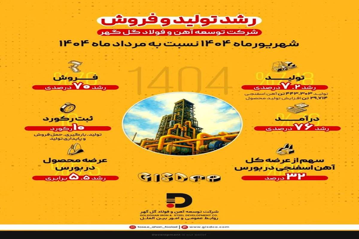 شرکت توسعه آهن و فولاد گلگهر در شهریور امسال نسبت به مردادماه، ۷.۲ درصد رشد تولید و ۷۰ درصدی افزایش فروش داشت.