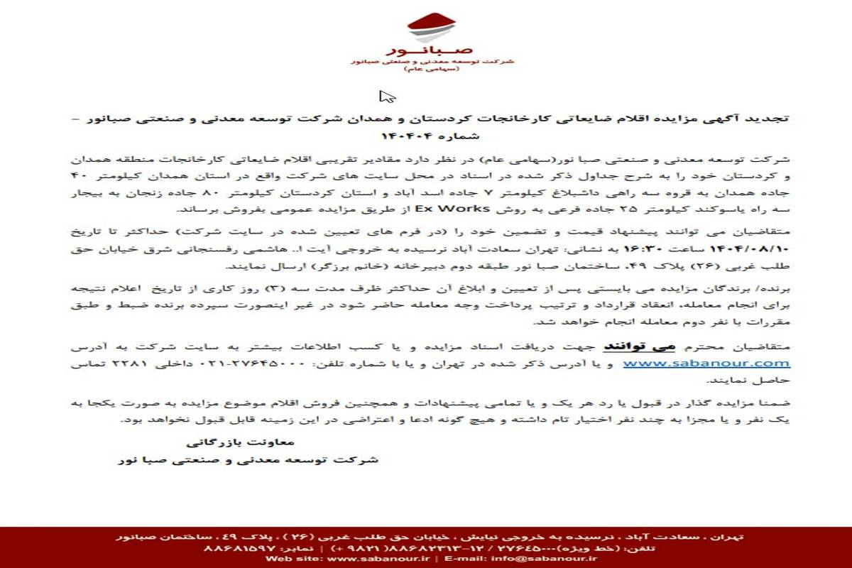 شرکت توسعه معدنی و صنعتی صبا نور(سهامی عام) در نظر دارد مقادیر تقریبی اقلام ضایعاتی کارخانجات منطقه همدان و کردستان خود را به شرح جداول ذکر شده در اسناد در محل سایت های شرکت واقع در استان همدان کیلومتر ۴۰ جاده همدان به قروه سه راهی داشبلاغ کیلومتر ۷ جاده اسد آباد و استان کردستان کیلومتر ۸۰ جاده زنجان به بیجار سه راه یاسوکند کیلومتر ۲۵ جاده فرعی به روش Ex Works از طریق مزایده عمومی بفروش برساند.