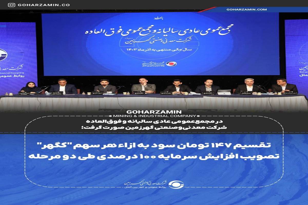 مجمععمومی عادی سالیانه سال مالی منتهی به ۳۰ آذر ۱۴۰۳ و مجمععمومی فوقالعاده شرکت معدنیوصنعتی گهرزمین با حضور بیش از ۹۴درصد سهامداران صبح امروز در هتل المپیک تهران برگزار شد و تقسیم ۱۴۷تومان سود به ازاء هر سهم به تصویب حاضرین رسید.