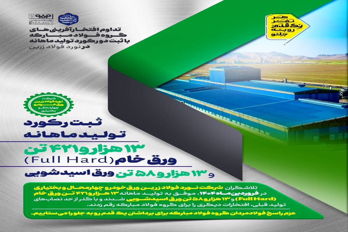 کارکنان شرکت نورد فولاد زرین ورقخودرو چهارمحال و بختیاری در فروردین۱۴۰۴ با تولید ۱۳,۴۲۱ تن ورق خام و ۱۳,۰۵۸ تن ورق اسیدشویی، رکورد جدیدی در تولید ثبت کردند.