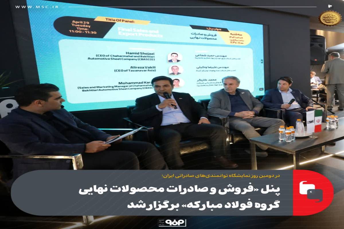 همزمان با برگزاری دومین روز از هفتمین نمایشگاه بین‌المللی توانمندی‌های صادراتی جمهوری اسلامی ایران(ایران‌اکسپو ۲۰۲۵)، پنل «فروش و صادرات محصولات نهایی گروه فولاد مبارکه»، صبح امروز (۹ اردیبهشت‌ماه ۱۴۰۴) با حضور حمید شجاعی، مدیرعامل شرکت ورق‌خودرو چهارمحال و بختیاری، علیرضا وکیلی، مدیرعامل شرکت صنایع فولاد توان‌آور آسیا، فرشید فرزین، مشاور صادرات شرکت ورق‌خودرو چهارمحال و بختیاری و محمد کارگر، مدیر فروش و بازاریابی شرکت ورق‌خودور و چهارمحال و بختیاری برگزار شد.