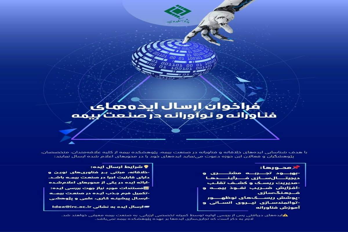 در پی تحولات فناوری و نیاز روزافزون صنعت بیمه به نوآوریهای خلاقانه و فناورانه، پژوهشکده بیمه اقدام به انتشار فراخوانی جهت جذب ایدههای نوآورانه نموده است. این فراخوان با هدف شناسایی و حمایت از ایدههای برتر و متناسب با چالشها و فرصتهای جدید صنعت بیمه، گامی مؤثر در راستای توسعه پایدار این صنعت محسوب میشود.روابط عمومی پژوهشکده بیمه اعلام کرد با هدف شناسایی ایدههای خلاقانه و فناورانه در صنعت بیمه، از تمامی علاقهمندان، متخصصان، پژوهشگران و فعالات این حوزه دعوت بعمل میآید تا ایدههای خود را در محورهای «بهبود تجربه مشتری و دیجیتالسازی فرآیندها»، «مدیریت ریسک و کشف تقلب»، «افزایش ضریب نفوذ بیمه و فرهنگسازی»، «پوشش ریسکهای نوظهور» و «توانمندسازی نیروی انسانی و آموزش فناورانه» ارسال نمایند. ایدهها به هر نوع راهحل نوآورانه و مبتنی بر فناوری اطلاق میشود که امکان اجرایی شدن آن در صنعت بیمه وجود داشته باشد. تأکید پژوهشکده بیمه بر این است که ایده «خلاقانه» بوده و «قابلیت عملیشدن» در صنعت بیمه داشته باشد.