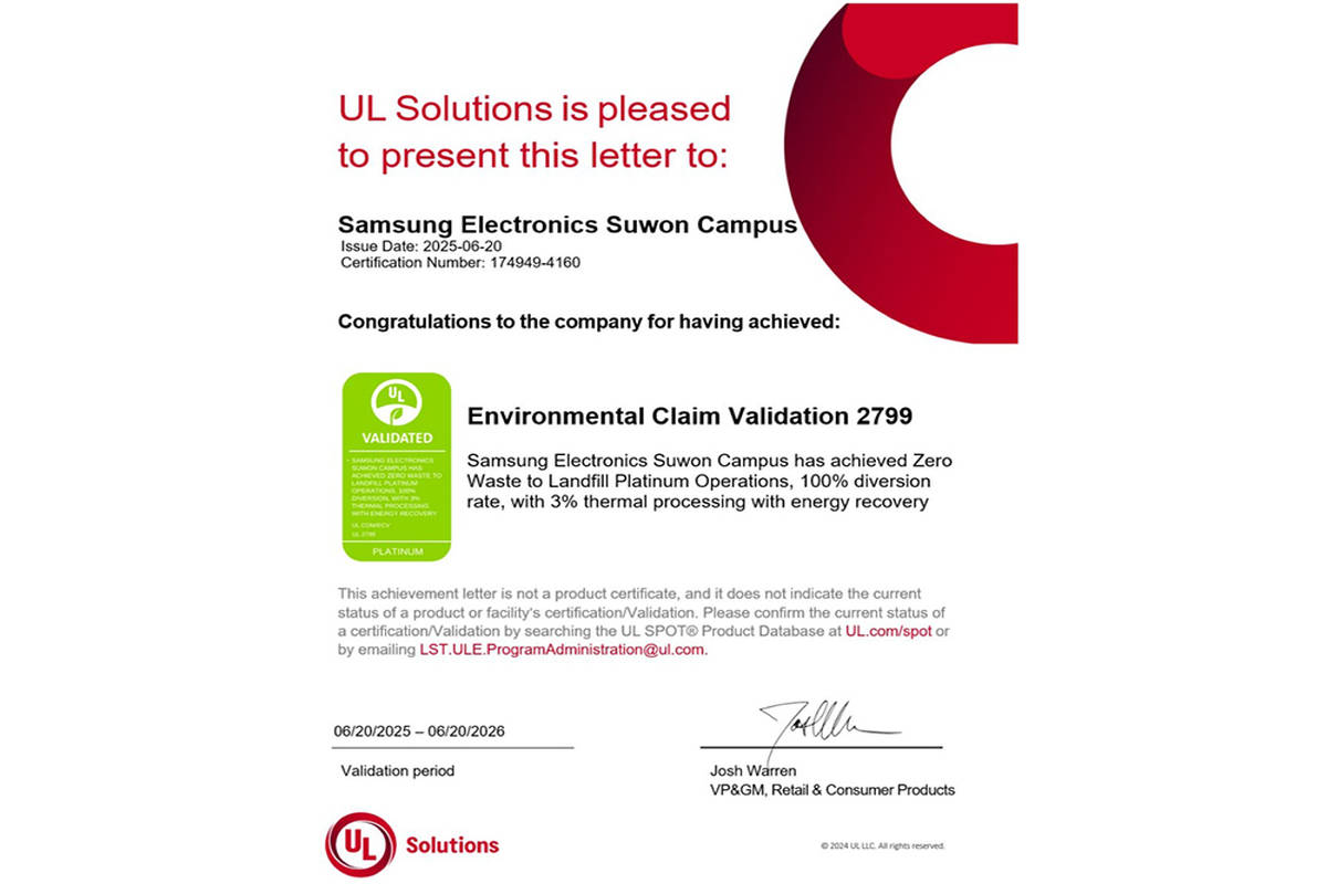شرکت سامسونگ الکترونیکس در تمامی مراکز تولیدی خود در سراسر جهان، موفق به دریافت بالاترین سطح گواهی «حذف کامل دفن زباله» (Zero Waste to Landfill) از مؤسسه UL Solutions شده است.