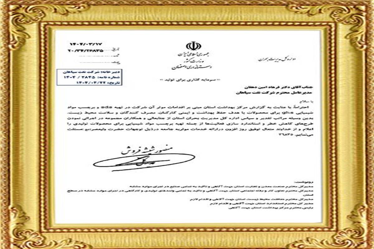 به نقل از روابط عمومی شرکت نفت سپاهان، در این نامه که از سوی منصور شیشهفروش، مدیرکل مدیریت بحران استان صادر شده، با اشاره به گزارش مرکز بهداشت استان، از تهیه برچسبهای GHS و برگههای اطلاعات ایمنی مواد (SDS) برای محصولات شرکت نفت سپاهان به عنوان گامی مؤثر در راستای حفظ سلامت کارکنان، مصرفکنندگان و محیط زیست یاد شده است.