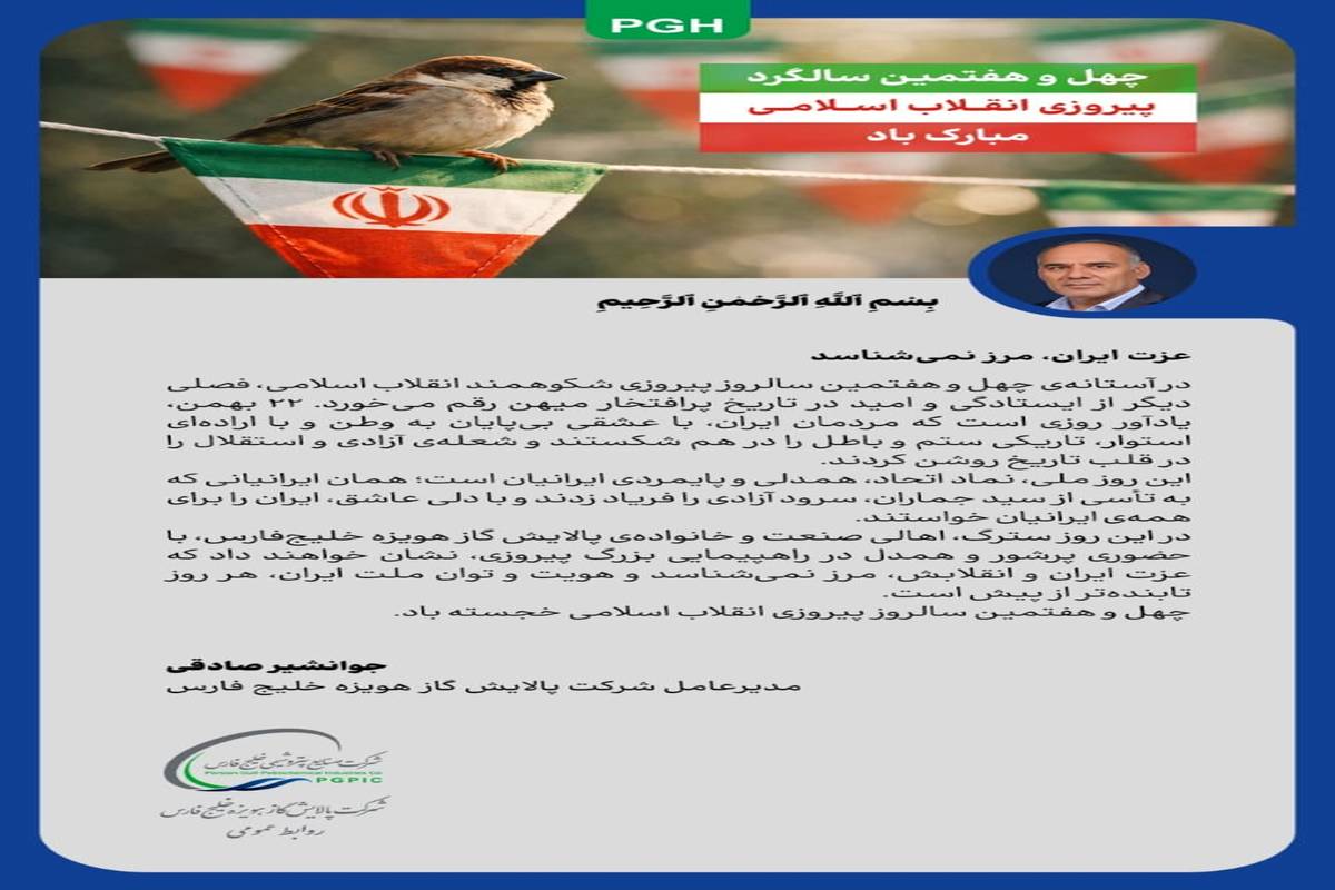 جوانشیر صادقی مدیرعامل پالایش گاز هویزه خلیج‌فارس ، در پیامی فرا رسیدن چهل و هفتمین سالگرد پیروزی انقلاب اسلامی را تبریک گفت.