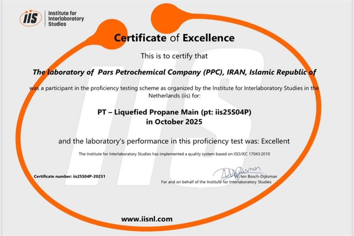 آزمایشگاه شرکت پتروشیمی پارس (PPC) موفق شد گواهینامه عملکرد ممتاز (Certificate of Excellence) را در آزمون مهارتآزمایی بینالمللی از مؤسسه مطالعات بینآزمایشگاهی (IIS) هلند دریافت کند.