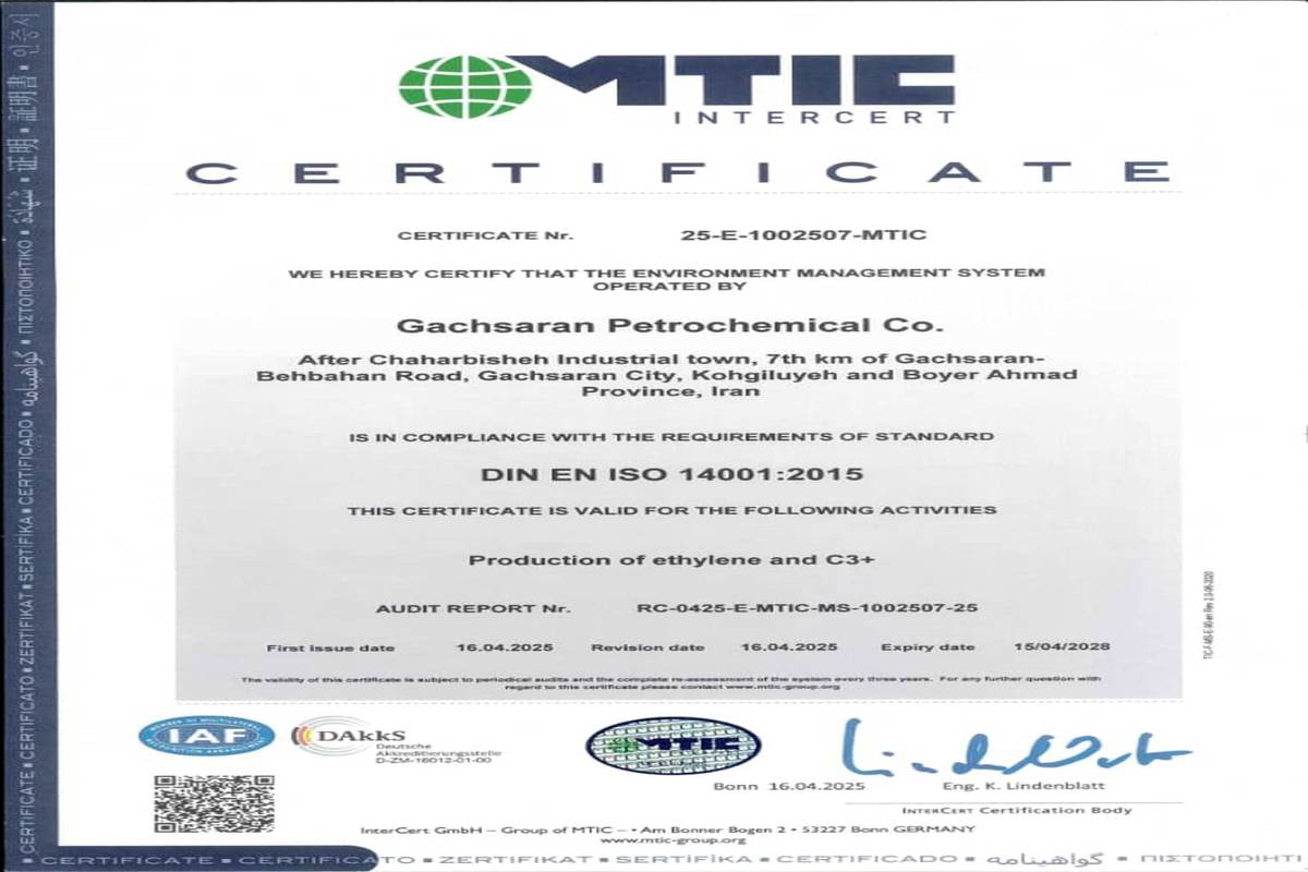 شرکت پتروشیمی گچساران موفق به دریافت گواهینامه بینالمللی ISO ۱۴۰۰۱:۲۰۱۵ از نهاد معتبر صدور گواهینامه MTIC InterCert واقع در آلمان شد.